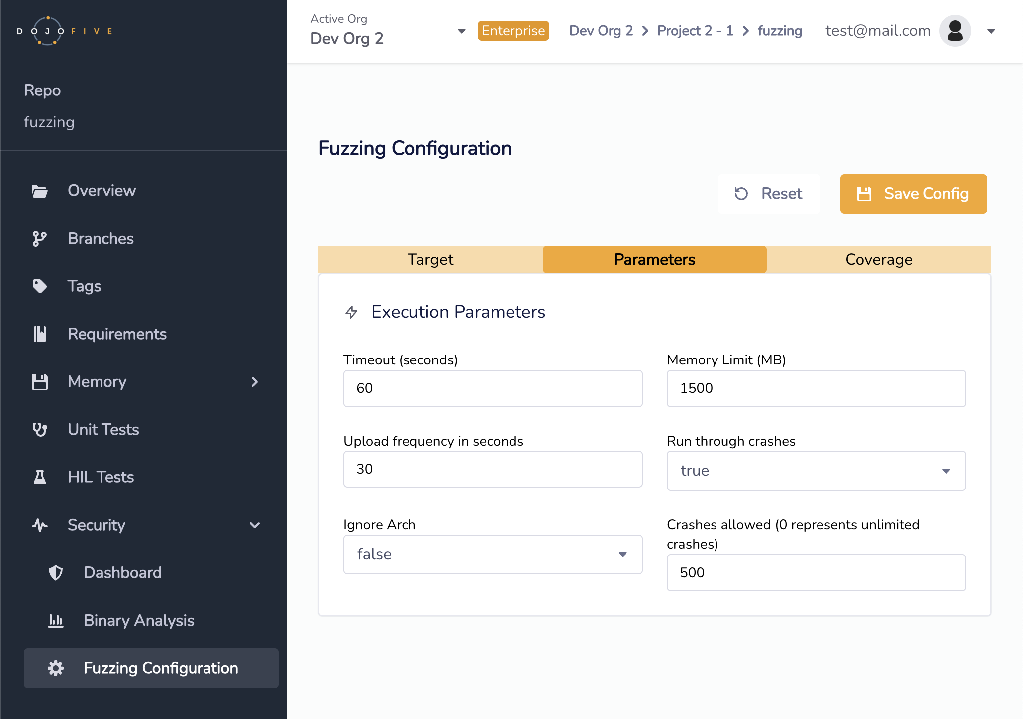 On a normal run, eo fuzz pulls all of its configuration from the EmbedOps platform