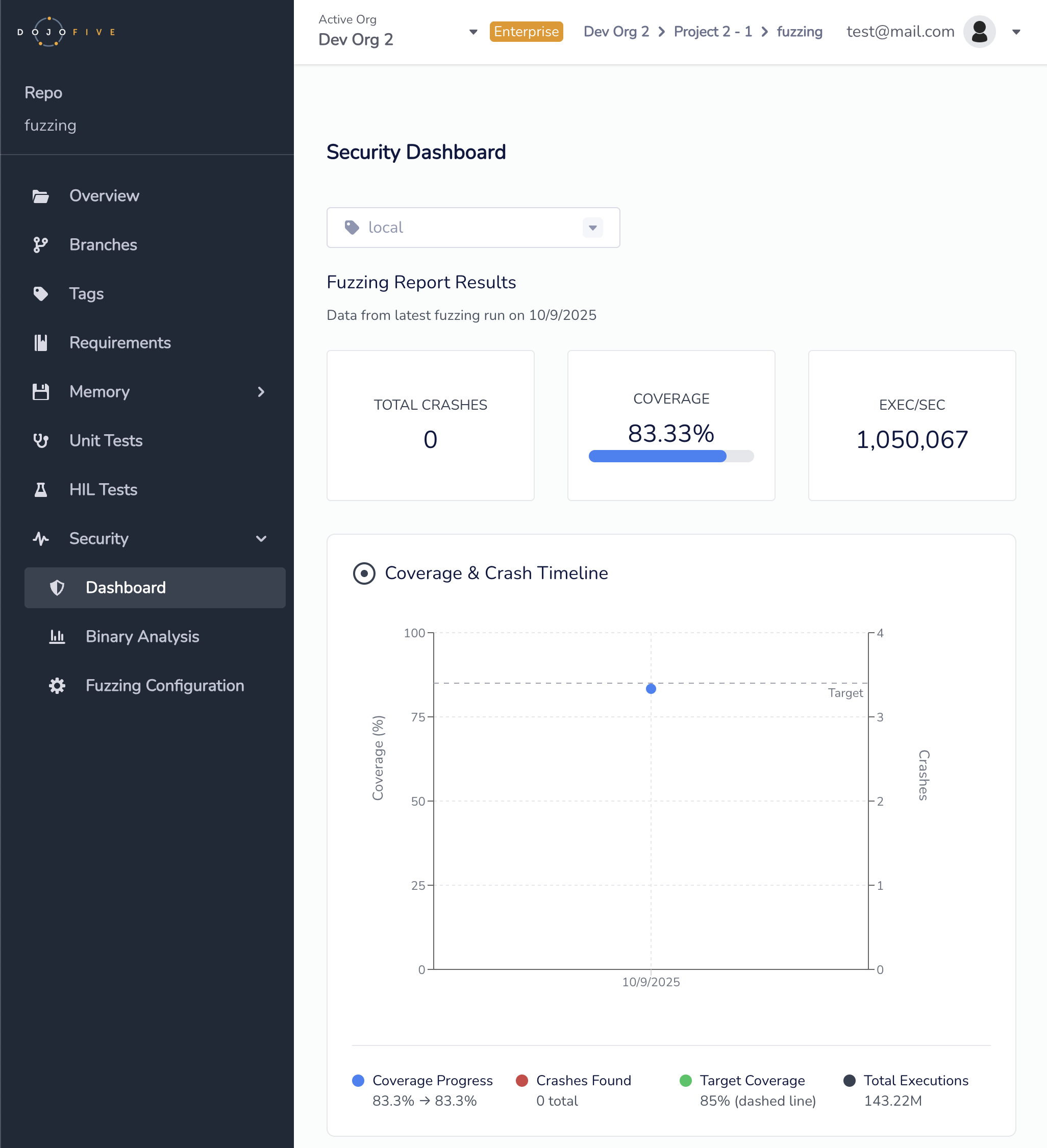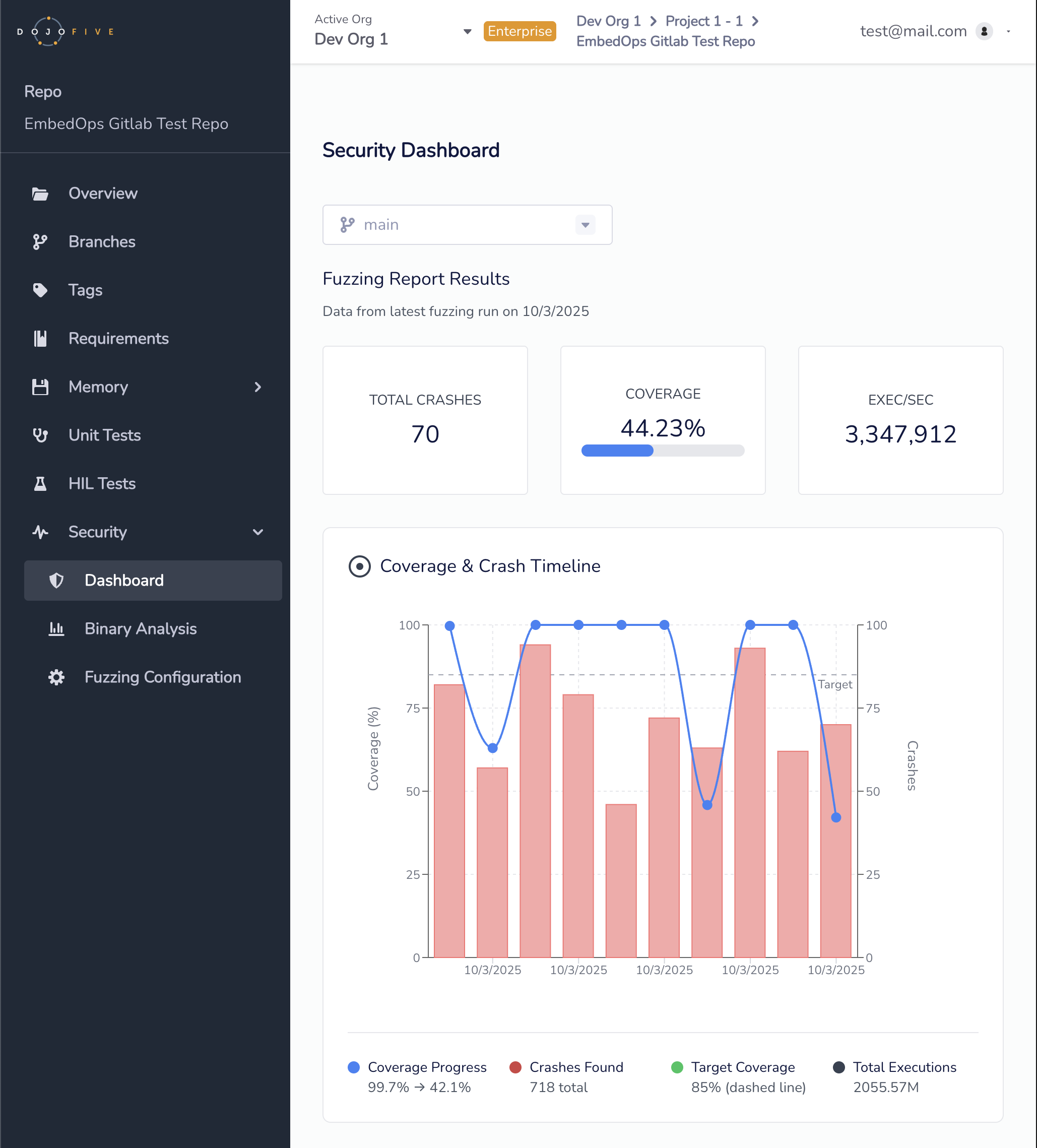 Fuzz testing or fuzzing is a software testing technique to discover vulnerabilities, crashes, and unexpected behaviors in a program. EmbedOps CLI can be used to add a fuzz testing template to get you started on running a fuzzer on your project.